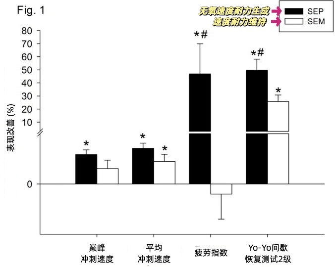 这张柱状图直观对比了无氧速度耐力生成训练(SEP,黑柱)与速度耐力维持训练(SEM,白柱)对足球运动员多项体能指标的提升幅度(%),SEP 的整体提升效果显著优于 SEM,尤其在抗疲劳和高强度间歇能力上优势悬殊。